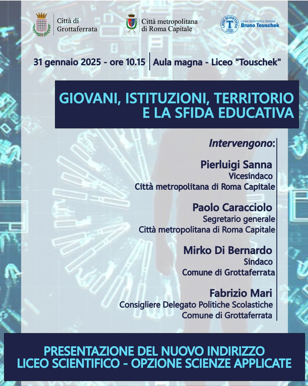 Si rende noto che il giorno venerdì 31 Gennaio p.v., dalle ore 10:15 alle ore12.15., si terrà in Aula Magna la conferenza di presenzazione del liceoscientifico delle Scienze Applicate,il nuovo indirizzo del Liceo Touschek che prenderà l’avvio dall’a.s. 2025/26. All’incontro parteciperanno il Vicesindaco di Roma Pierluigi Sanna, il Direttore Generale della Città Metropolitana PaoloCaracciolo, il Sindaco di Grottaferrata Mirko Di Bernardo ed il Consigliere delegato alle politiche scolastiche di Grottaferrata Fabrizio Mari. La conferenza verterà anche sulrapporto tra i giovani, leistituzioni ed il territorio nella complessità della sfida educativa.